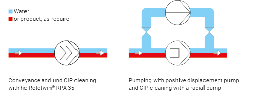 The very high rotational speed ranges enable the product or the cleaning fluid to be pumped by the same pump. Expensive procurement and operating costs of a bypass line are avoided. When used for cleaning, the RotoTwin® achieves very high rotational speeds up to 4'000 min−1. This provides optimal cleaning for the pipework as well as the pump, thus ensuring outstanding results for cleaning in place (CIP). When used with low viscosity media the screw pump achieves a pressure of up to 30 bar with the result that the product can be expelled from the pipework with water. The RotoTwin® is designed in such a way that there are no shadow or dead areas. All pump components in the production line are optimally exposed to the cleaning medium.